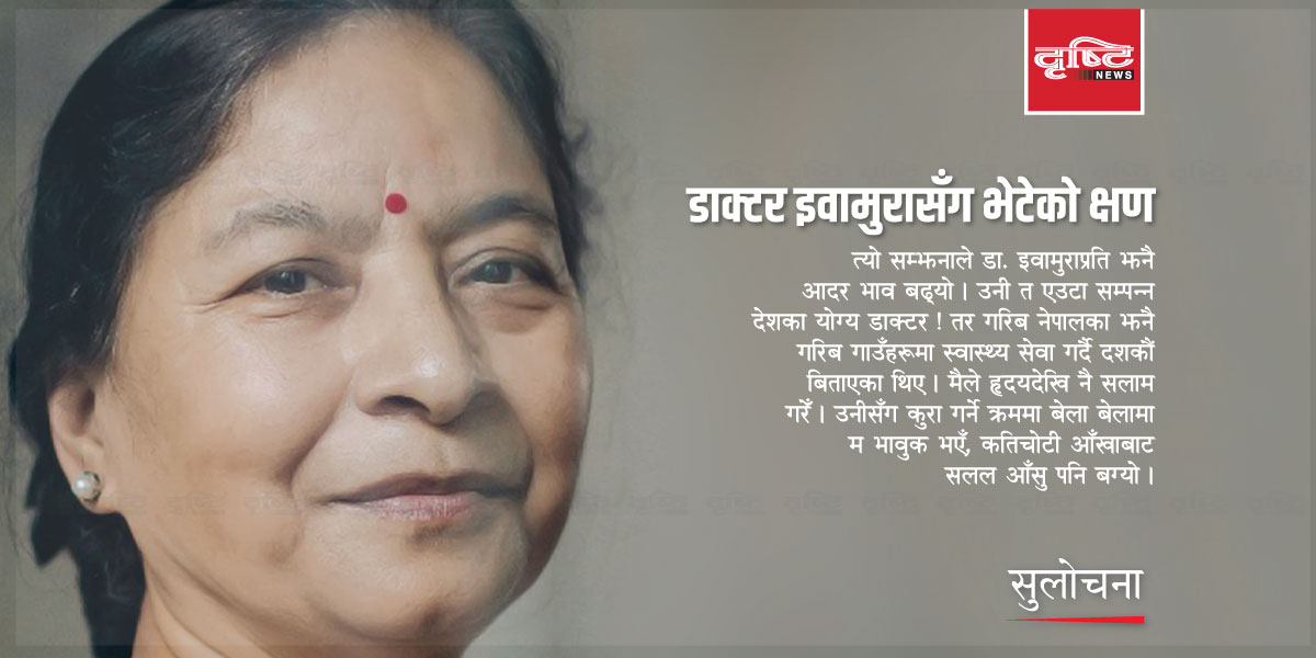 त्यो सम्झनाले डा. इवामुरा प्रति झनै आदर भाव बढ्यो । उनी त एउटा सम्पन्न देशका योग्य डाक्टर ! तर गरिब नेपालका झनै गरिब गाउँहरूमा स्वास्थ्य सेवा गर्दै दशकौं बिताएका थिए । मैले हृदयदेखि नै सलाम गरेँ । उनीसँग कुरा गर्ने क्रममा बेला बेलामा म भावुक भएँ, कतिचोटी आँखाबाट सलल आँसु पनि बग्यो । पहिले त आफुलाई अलि बलियै सम्झन्थेँ, त्यतिबेला के भयो कुन्नी, आफूलाई सम्हाल्न पनि सकिनँ । त्यतिबेला म अझै एक युवा आमा थिएँ ।