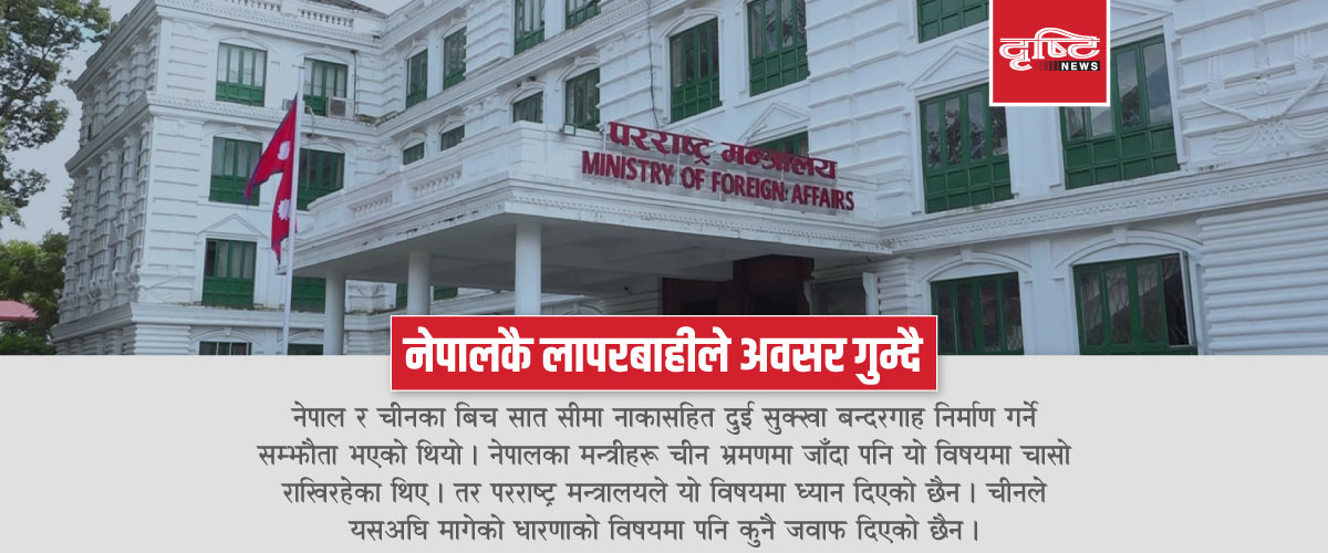 यो पत्र पठाएको नौ महिना बितिसक्दा पनि नेपाल सरकारले जवाफ फर्काउन नसक्नुमा परराष्ट्र मन्त्रालयको कमजोरी देखिएको छ । ‘चीन पुगेर नेपालका नेताहरू नाका खुलाउनु¥यो भन्ने आग्रह गर्छन्, चीनले तदारुकताका साथ चासो राख्छ तर नेपाली पक्षले भने आठ महिनासम्म बेवास्ता गर्छ, यसरी सहयोग दिन तयार हुँदा पनि सरकारले सहयोग लिन चाहिरहेको छैन, नाका खुलाउन परराष्ट्र मन्त्रालय नै बाधक देखिएको छ,’ परराष्ट्रका एक कर्मचारीले दृष्टिसँग भने ।