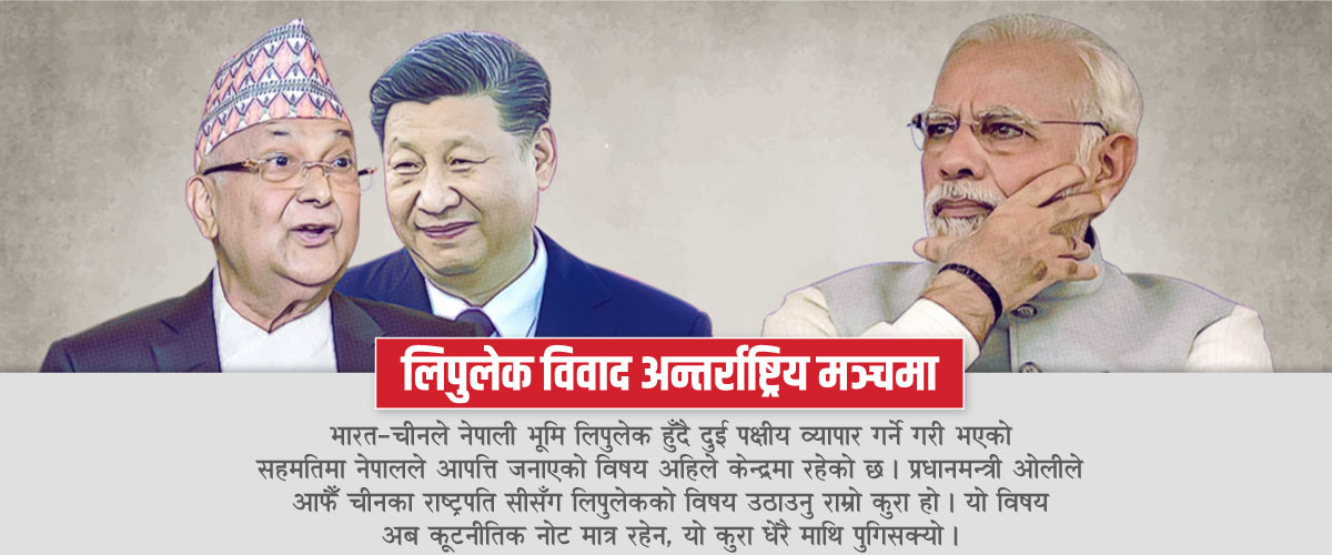 खासगरी भारत र चीनले नेपाली भूमि लिपुलेक हुँदै दुई पक्षीय व्यापार गर्ने गरी भएको सहमतिमा नेपालले आपत्ति जनाएको विषय अहिले केन्द्रमा रहेको छ ।