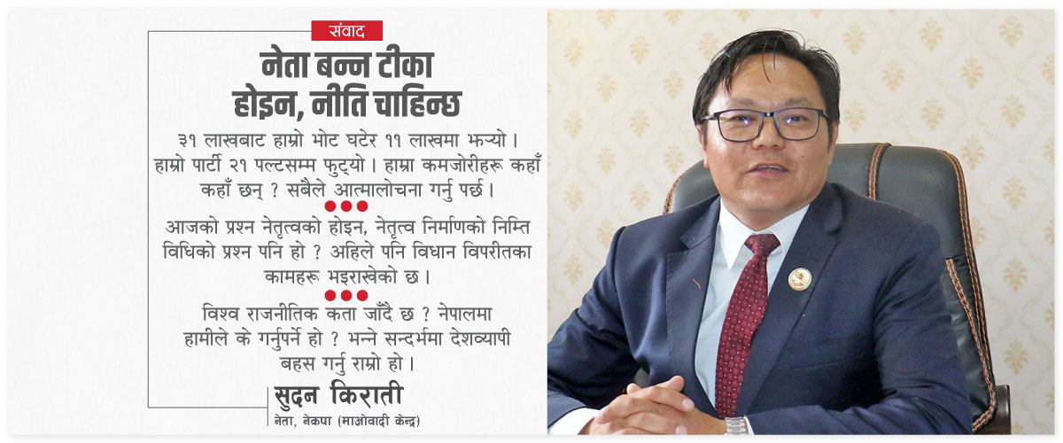 पार्टीभित्रको अन्तरसंघर्ष, आन्तरिक लोकतन्त्रको अवस्था, प्रचण्डको विकल्प, माओवादी र समाजवादी पृष्ठभूमिका दलबिच एकताको सम्भावनालगायतका विषयमा माओवादी केन्द्रका नेता एवं पूर्वमन्त्री सुदन किरातीसँग दृष्टिले गरेको कुराकानीको सम्पादित अंश ।