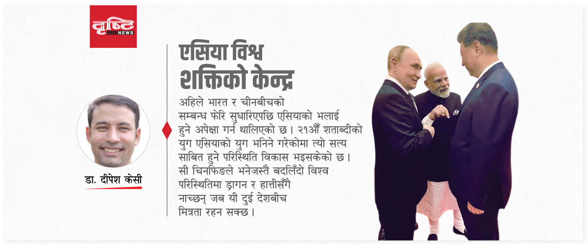 यसको नकारात्मक असर नेपालसम्म पनि प¥यो । अहिले भारत र चीनबीचको सम्बन्ध फेरि सुधारिएपछि एसियाको भलाई हुने अपेक्षा गर्न थालिएको छ । २१औँ शताब्दीको युग एसियाको युग भनिने गरेकोमा त्यो सत्य साबित हुने परिस्थिति विकास भइसकेको छ । सी चिनफिङले भनेजस्तै बदलिँदो विश्व परिस्थितिमा ड्रागन र हात्तीसँगै नाच्छन् जब यी दुई देशबीच मित्रता रहन सक्छ ।