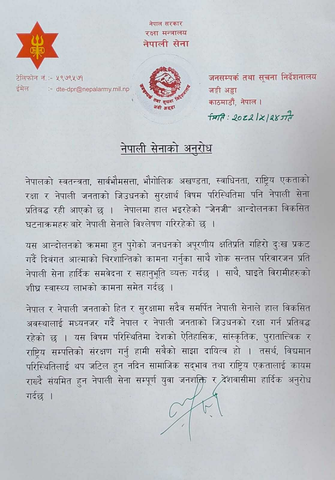 सैनिक जनसम्पर्क निर्देशनालयले विज्ञप्ति जारी गर्दै नेपाल र नेपाली जनताको जिउज्यानको रक्षा गर्न प्रतिबद्ध रहेको भनदै संयमता अपनाउन सबैमा अपिल गरेको हो ।