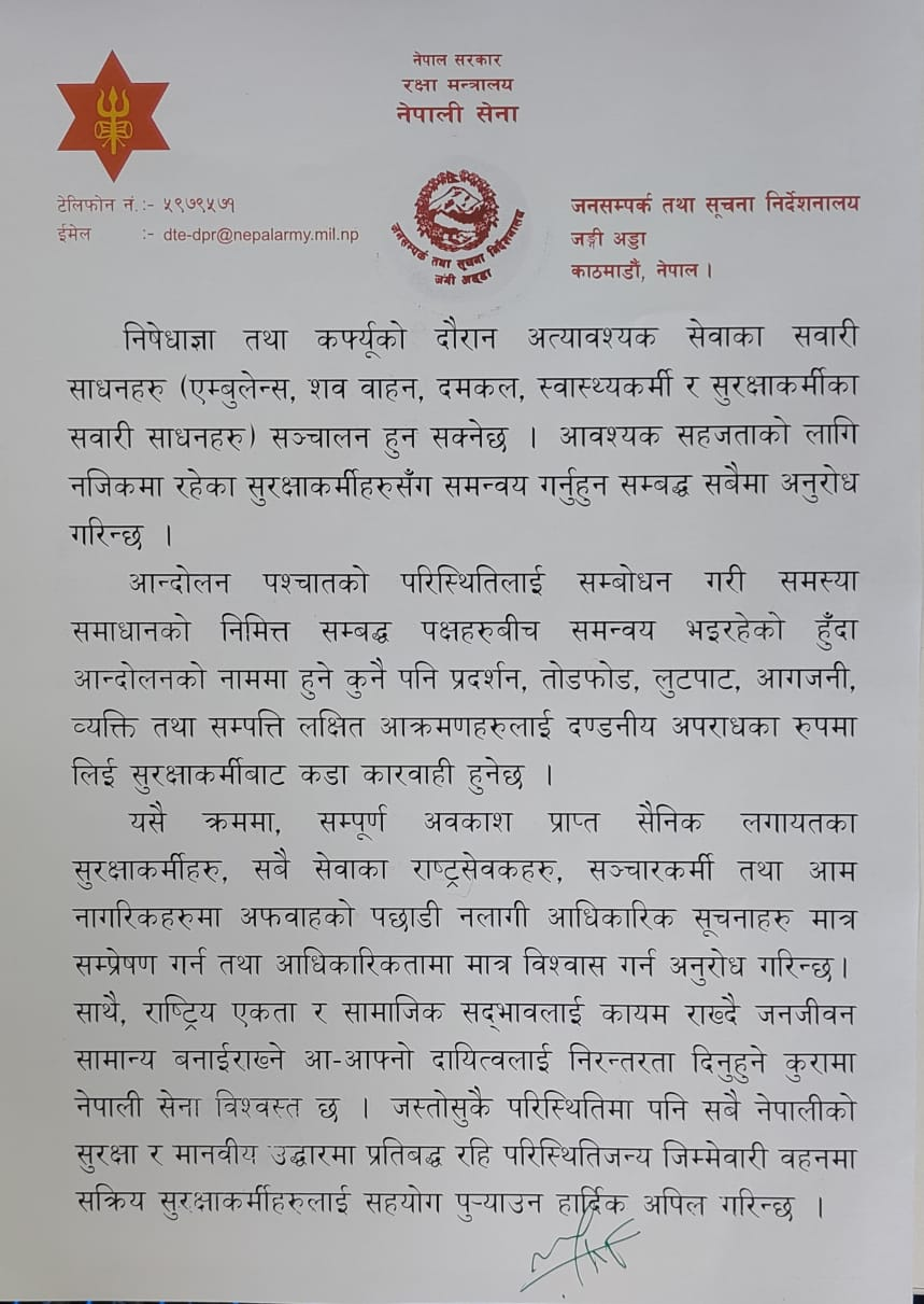 सेनाले आन्दोलनको नाममा हुने कुनै पनि तोडफोड, लुटपाट, आगजनी वा व्यक्ति तथा सम्पत्तिमाथिको आक्रमणलाई दण्डनीय अपराध मानिने र त्यस्ता क्रियाकलाप गर्नेमाथि कडा कारबाही गरिने चेतावनी दिएको छ ।