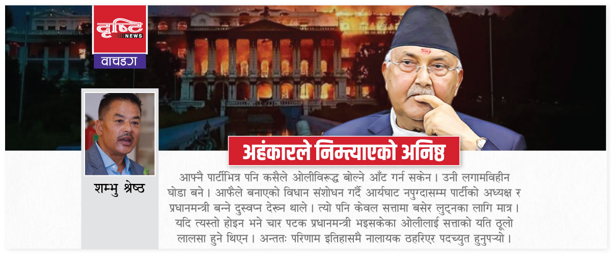 एउटा व्यक्तिको दम्भ र अहंकारले देश क्षणभरमै खरानी भयो । सामाजिक सञ्जालमाथि लगाइएको प्रतिबन्ध फुकुवाको मागका साथै, भ्रष्टाचारको अन्त्य र सुशासनको माग गर्दै गत सोमबार हजारौँ विद्यार्थी स्कुल, कलेजको ड्रेसमै आन्दोलनमा उत्रिए ।