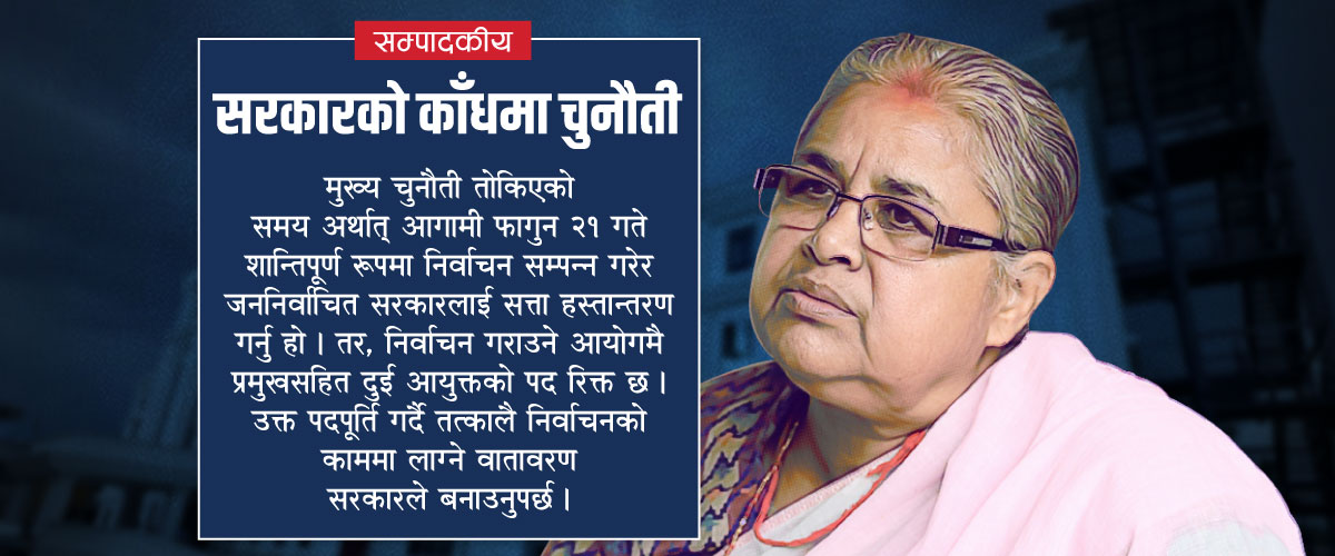 मुख्य चुनौती तोकिएको समय अर्थात् आगामी फागुन २१ गते शान्तिपूर्ण रूपमा निर्वाचन सम्पन्न गरेर जननिर्वाचित सरकारलाई सत्ता हस्तान्तरण गर्नु हो । तर, निर्वाचन गराउने आयोगमै प्रमुखसहित दुई आयुक्तको पद रिक्त छ । उक्त पदपूर्ति गर्दै तत्कालै निर्वाचनको काममा लाग्ने वातावरण सरकारले बनाउनुपर्छ ।