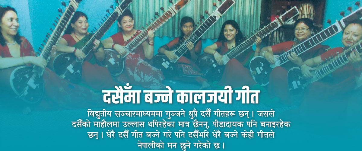 काठमाडौं । दसैँ आउनु केही दिन अगाडिदेखि विद्युतीय सञ्चारमाध्यम मङ्गल धुन बज्न थाल्छ । त्यसरी बज्ने दसैँ गीतले झनै दसैँमा रौनकता थपिदिन्छ । नेपाली गीत सङ्गीतको इतिहासमा दसैँसम्बन्धी गीतले ठूलो महत्त्व राखेको छ ।