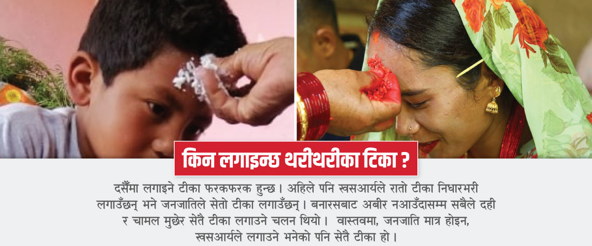 विजयदशमीमा लगाइने टीका फरकफरक हुन्छ । अहिले पनि खसआर्यले रातो टीका निधारभरी लगाउँछन् भने मगर, राई, लिम्बू, गुरुङ, तामाङ, नेवारलगायत जनजातिले सेतो टीका लगाउँछन् ।