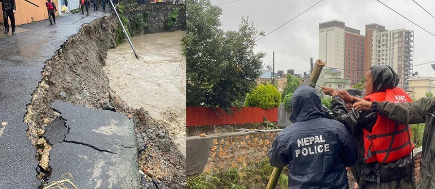 काठमाडौँ । निरन्तर वर्षापछि काठमाडौं महानगरपालिका-१४ को कोहिनुर हाउजिङ नजिकै करखुसी खोलाको छेउमा पहिरो गएर सडक भासिएको छ ।