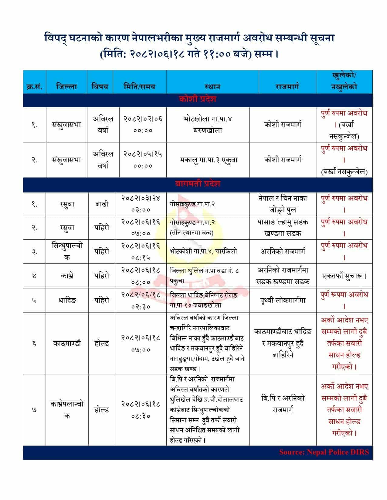 त्यसैगरी, काभ्रेपलाञ्चोक र काठमाडौंमा भने तत्काल अर्को आदेश नभएसम्म दुबै तर्फबाट सवारीसाधन होल्ड गरिएको प्रहरीले जनाएको छ । नेपाल प्रहरीले प्रभावित क्षेत्रमा पहिरो पन्छाउने र सडक खुलाउने कार्य जारी रहेको जनाएको छ। साथै, यात्रु र चालकलाई अत्यावश्यकबाहेक यात्रा नगर्न अनुरोध समेत गरिएको छ ।