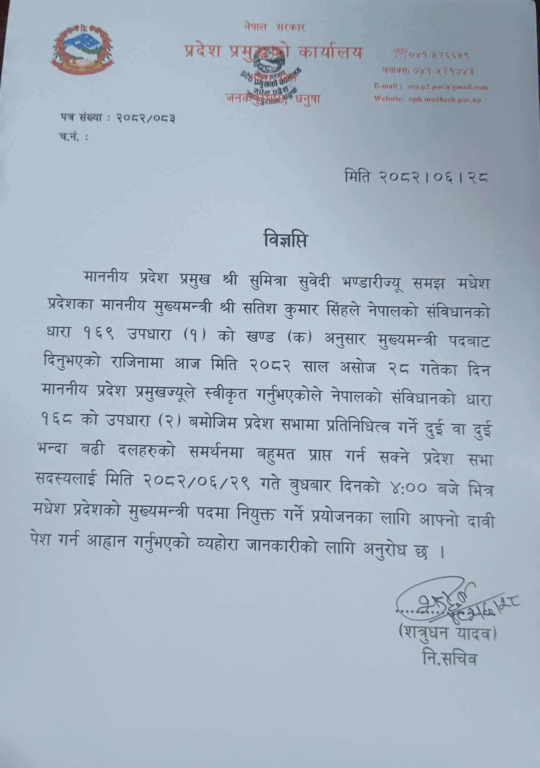 आजै मुख्यमन्त्री सतिश कुमार सिंहले पदबाट राजीनामा दिएका थिए । विश्वासको मत लिन मङ्गलवारका लागि बोलाइएको प्रदेश सभा बैठकमा उनले आफ्ना कुरा राख्दै राजीनामाको घोषणा गरेका हुन् ।