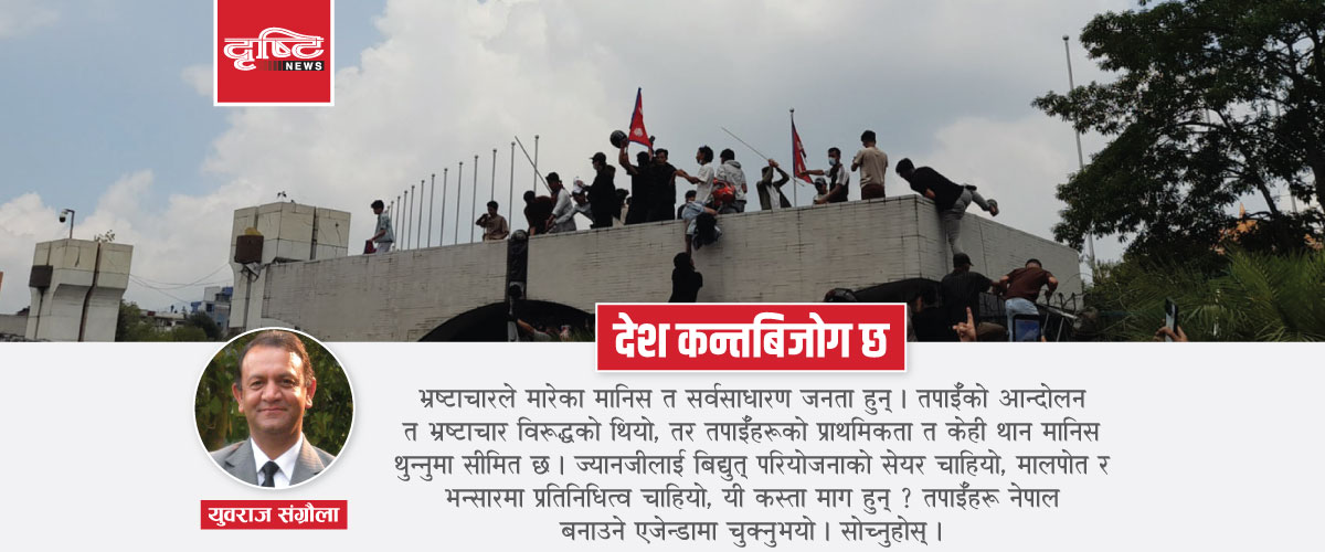 ५. भ्रष्टाचारले मारेका मानिस त सर्वसाधारण जनता हुन् । तपाईँको आन्दोलन त भ्रष्टाचार विरुद्धको थियो, तर तपाईँहरूको प्राथमिकता त केही थान मानिस थुन्नुमा सीमित छ । ज्यानजीलाई बिद्युत् परियोजनाको सेयर चाहियो, मालपोत र भन्सारमा प्रतिनिधित्व चाहियो, यी कस्ता माग हुन् ? तपाईँहरू नेपाल बनाउने एजेन्डामा चुक्नुभयो । सोच्नुहोस् ।