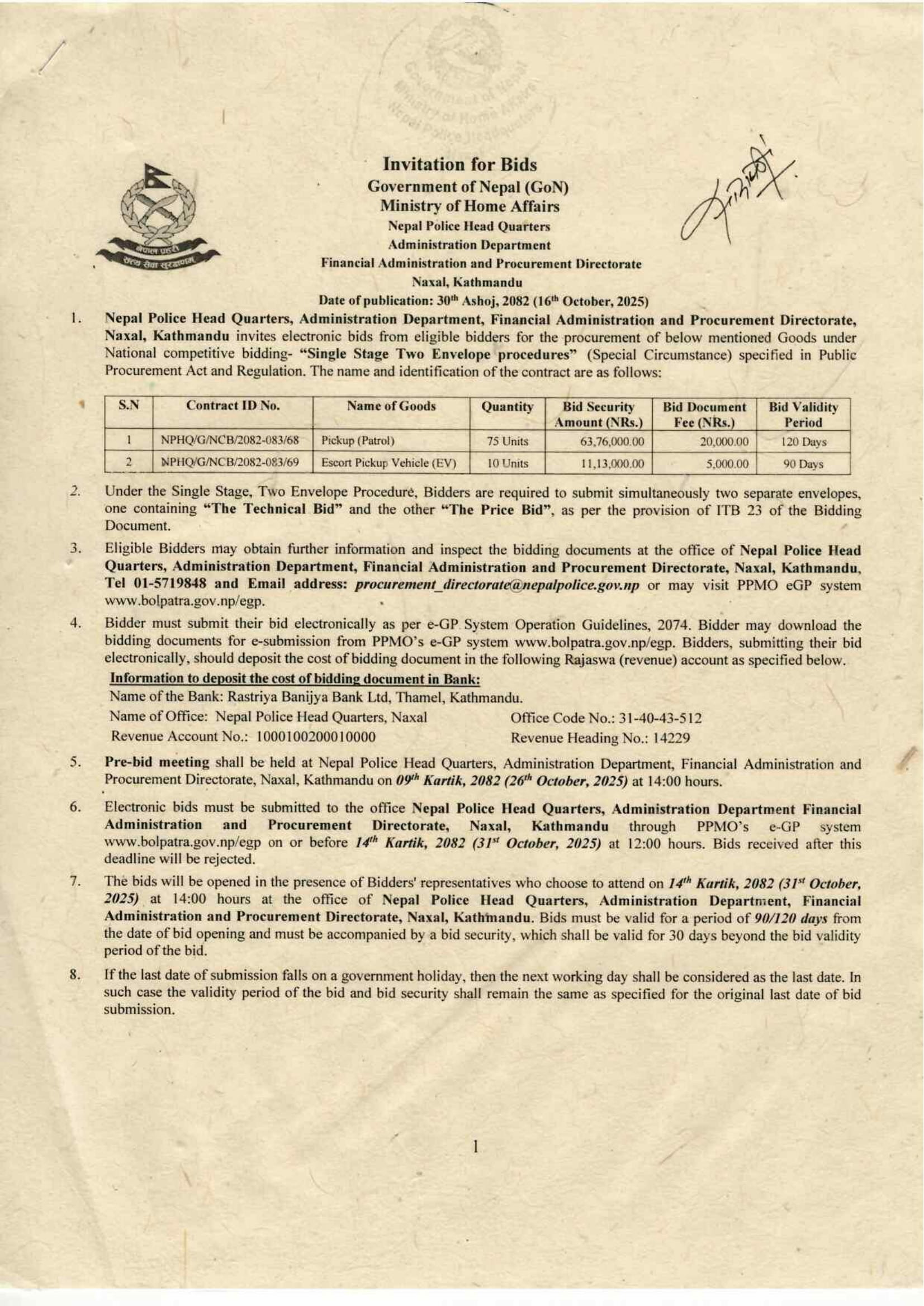 प्रहरीका अनुसार टेण्डरहरू १४ कात्तिक (३१ अक्टोबर) मा अपराह्न २ बजे खोलिने छन् । टेण्डरहरू बैंक ग्यारेन्टीसहित पेस गर्नुपर्ने र उक्त ग्यारेन्टी टेण्डर वैधता अवधि भन्दा ३० दिन बढीको हुनुपर्ने छ ।
