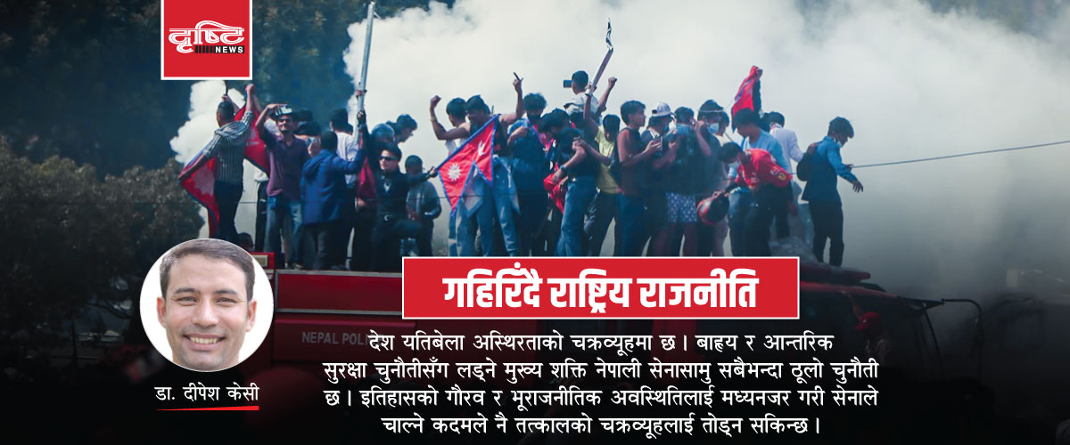 नेपालको भूमिको दुरुपयोग गरी छिमेकमा अस्थिरता मच्चाउन खोज्ने खेलहरू चलिरहेको प्रस्ट छ । तीव्र आर्थिक विकास र सैन्य शक्ति बलियो बनाउँदै लगेका चीन र भारतलाई छिमेकबाट चुनौती दिने रणनीति बुनिएका छन् । यही रणनीतिको मारमा नेपाल पर्ने खतरा छ । नेपाल र नेपाली जनताले बदलिँदो विश्व व्यवस्था र शक्तिराष्ट्रको छद्म युद्धका कारण चुनौती भोग्नुपरेको छ । अस्थिरताको चक्रव्यूहमा छ देश यतिबेला । बाह्य र आन्तरिक सुरक्षा चुनौतीसँग लड्ने मुख्य शक्ति नेपाली सेनासामु सबैभन्दा ठूलो चुनौती छ । इतिहासको गौरव र भूराजनीतिक अवस्थितिलाई मध्यनजर गरी सेनाले चाल्ने कदमले नै तत्कालको चक्रव्यूहलाई तोड्न सकिन्छ ।