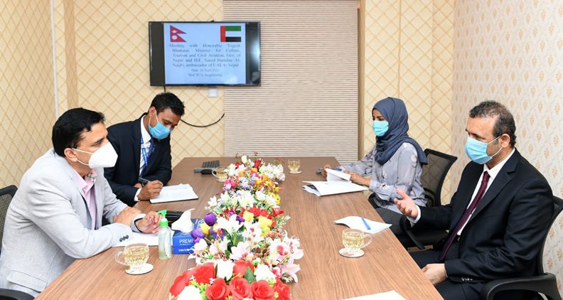 आज संस्कृति पर्यटन तथा नागरिक उड्डयन मन्त्री योगेश भट्टराई र संयुक्त अरव ईमरेटस (युएई) का राजदुत सईद हमदान अल नाक्बी बीच भएको शिष्टाचार भेटमा मन्त्री भट्टराईले उड्डयनको क्षेत्रमा युएई सरकार र ब्यवसायीहरुलाई आग्रह गर्नु भएको हो ।