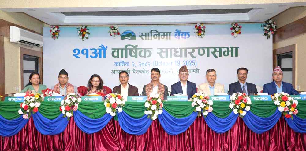 काठमाडौं । सानिमा बैंक लिमिटेडको आइतबार २१औं वार्षिक साधारणसभा सम्पन्न भएको छ । सभाको अध्यक्षता बैंकका अध्यक्ष तुकप्रसाद पौडेलले गरेका थिए ।