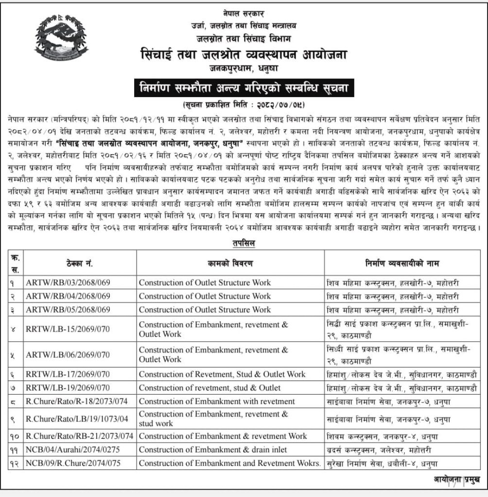 सिँचाइ तथा जलस्रोत व्यवस्थापन आयोजना जनकपुरधामले आज सूचना जारी गर्दै १६ जेठ २०८१ र १ साउन २०८१ मा ठेक्का अन्त्य गर्ने आशयको सूचना दिइए पनि निर्माण व्यवसायीबाट सम्झौता बमोजिम काम सम्पन्न नगरी निर्माण अलपत्र पारेकाले ठेक्का अन्त्य गरिएको जानकारी दिएको छ ।