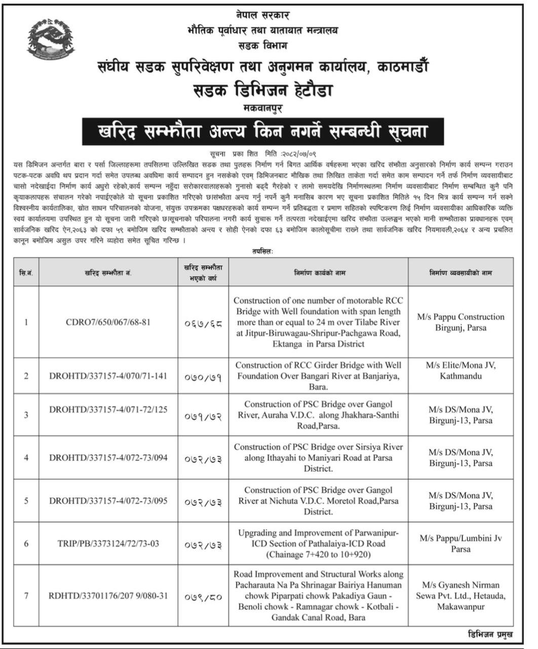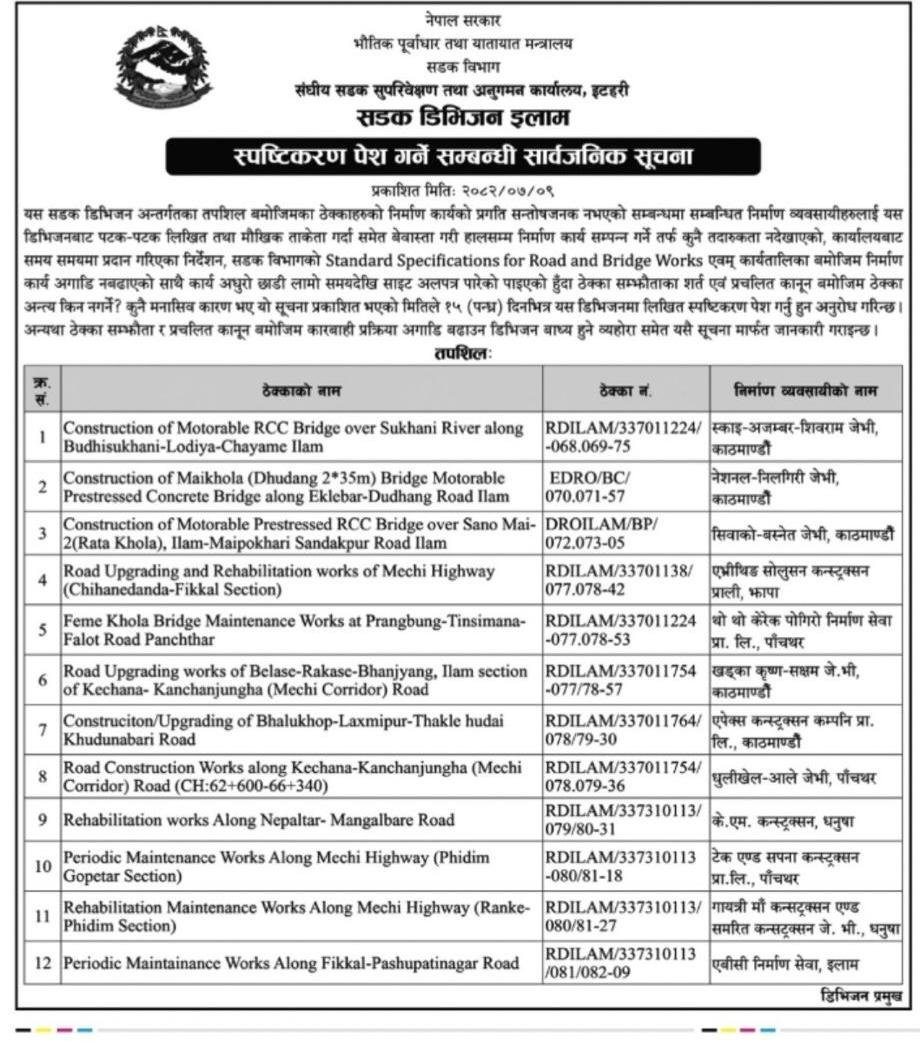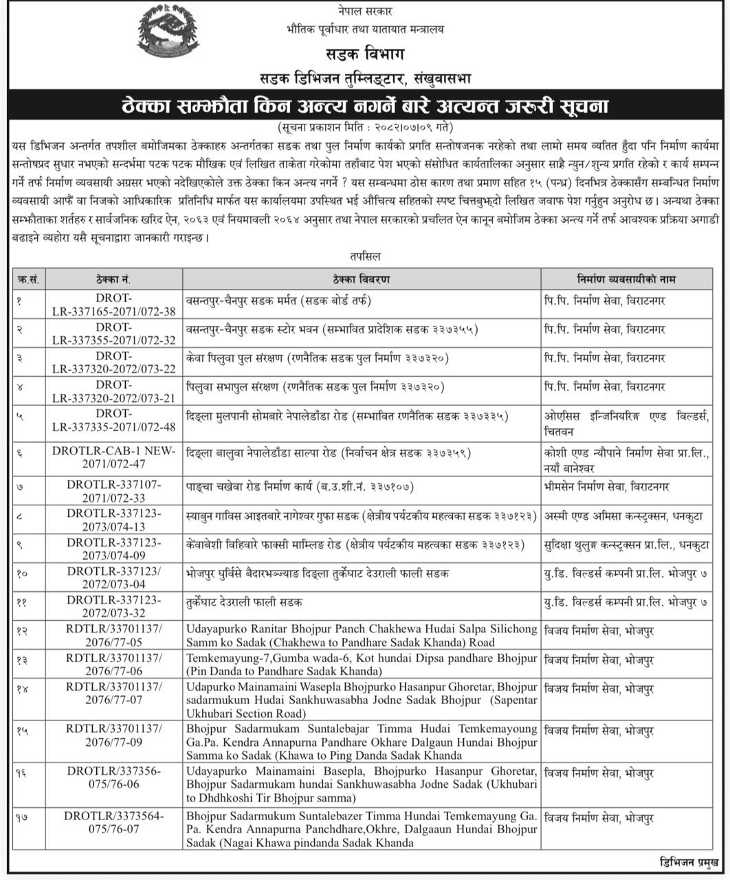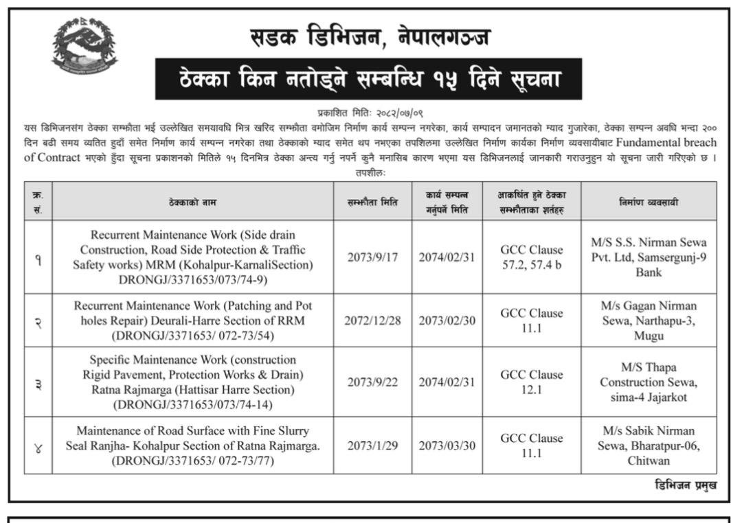 सडक विभागअन्तर्गत सडक डिभिजन कार्यालय तुम्लिङ्टार, इलाम, हेटौँडा र नेपालगन्जले आइतबार सूचना जारी गरेर आफू मातहत रुग्ण अवस्थामा रहेका ४० वटा ठेक्का तोड्ने प्रक्रिया अगाडि बढाइएको जानकारी दिएका हुन् ।