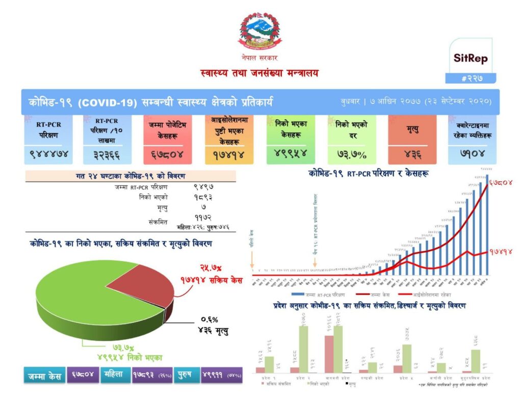 नेपालमा संक्रमितको संख्या ६७ हजार ८ सय ४ पुगेको छ । जसमध्ये ४ सय ३६ जनाले ज्यान गुमाएका छन् । नेपालमा ९ लाख ४४ हजार ४ सय ४७ जनामा कोरोना परीक्षण गरिएको छ ।
