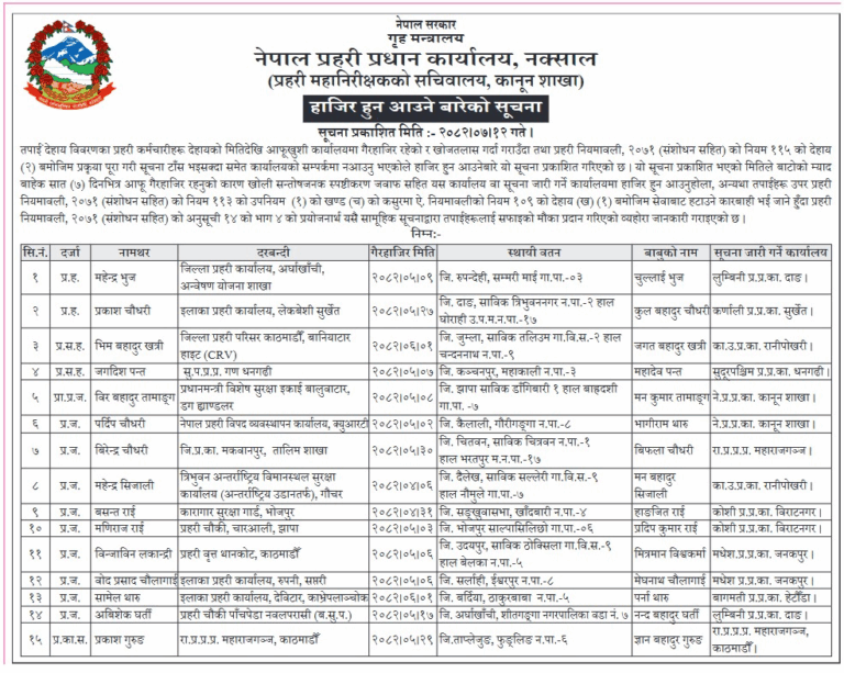 प्रहरी प्रधान कार्यालयले आज सूचना जारी गर्दै १५ जना प्रहरी लामो समयदेखि गैरहाजिर रहेका भन्दै उनीहरूलाई सम्पर्कमा आउन सात दिनको समय दिएको हो ।