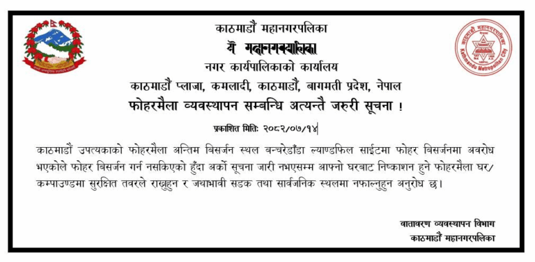काठमाडौं । काठमाडौं महानगरपालिकाले फोहर घरमै राख्न आग्रह गरेको छ । उपत्यकाको फोहर बिसर्जनस्थल बन्चरेडाँडा ल्याण्डफिल साइटमा फोहर फ्याक्न अवरोध भएपछि महानगरले सूचना जारी गर्दै फोहर घरमै सुरक्षित तबरले राख्न आग्रह गरेको हो ।