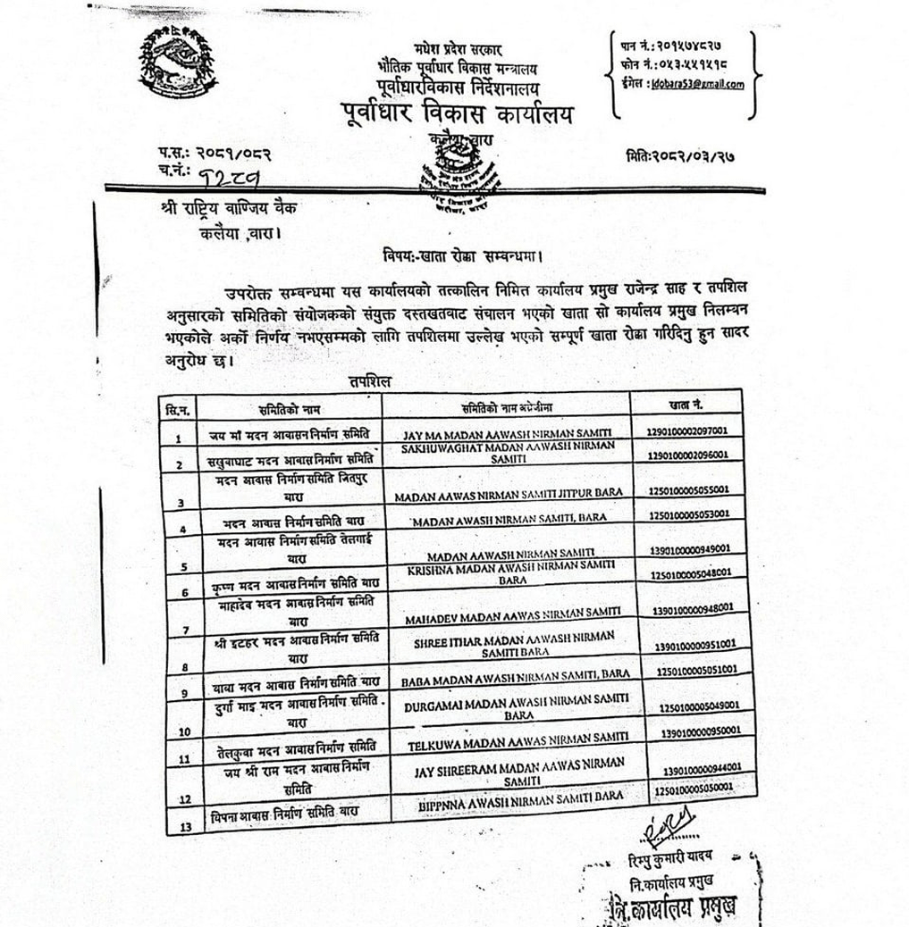 साहले निलम्बन भइसकेपछि गत बर्षको सिफारिस पेश गरी ३ वटा बैंकमा उपभोक्ता समितिका नाममा २०८२ असार २१ गतेसम्म १५ वटा खाता संचालन गरी जनता आवास कार्यक्रमका नाममा करिब २० करोड निकासा दिने तयारी गरेपछि अघिल्ला प्रमुख जिल्ला अधिकारी बसन्त अधिकारीले गएको साउन अन्तिममा खाता रोक्का राख्न निर्देशन दिएका थिए ।