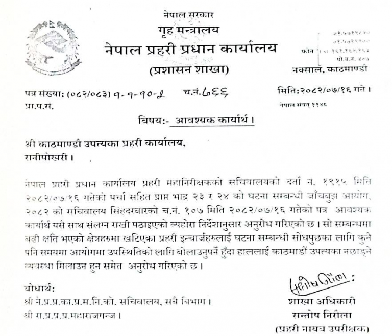 जेनजी आन्दोलनमा भएको दमन र त्यसपछिको आगजनीबारे जाँचबुझ गर्न गठन भएको आयोगको पत्रका आधारमा प्रहरी मुख्यालयले काठमाडौं उपत्यका प्रहरी कार्यालय रानीपोखरीलाई पत्र लेखी तत्कालीन इञ्चार्जहरूलाई काठमाडौं उपत्यका नछाड्ने भनेको हो ।