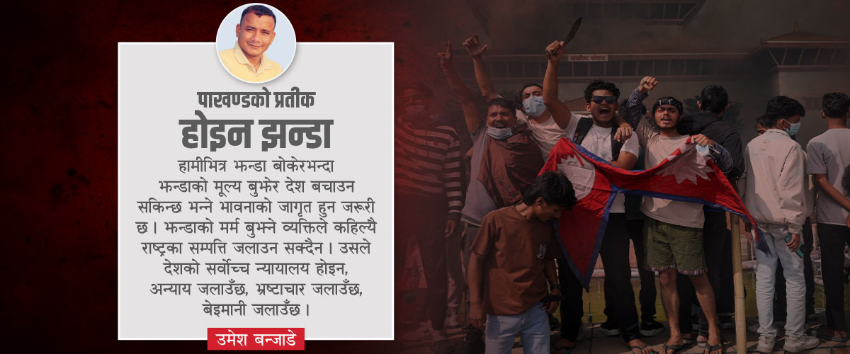 तर दुःखद कुरो, सिंहदरबार जलाउनेका काँधमा झन्डा देखियो, सर्वोच्च अदालत जलाउनेको हातमा पनि झन्डा, देशलाई खरानी बनाउनेको टाउकोमा समेत त्यही राष्ट्रिय झन्डा । आज विभिन्न बहानामा झन्डा बोकेर सडकमा हिँड्नेहरू धेरै छन्, तर हरेकको हातमा रहेको त्यो झन्डा देशको रक्षा होइन, अपराधको ढालजस्तै बन्दै गएको अनुभूति हुन्छ ।