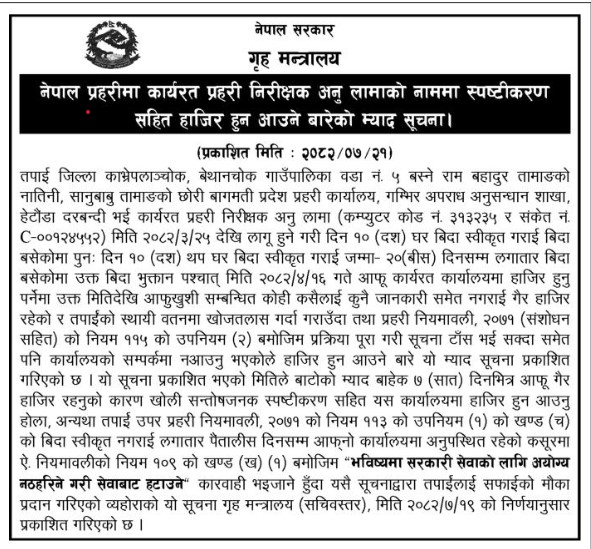काठमाडौं । बागमती प्रदेश प्रहरी कार्यालयमा कार्यरत प्रहरी निरीक्षक (इन्स्पेक्टर) अनु लामालाई सात दिनभित्र कार्यालयमा उपस्थित हुन निर्देश्न दिएको छ । उनी लामो समयदेखि कार्यालयमा गैर हाजिर रहेको भन्दै गृह मन्त्रालयले सार्वजनिक सूचनामार्फत स्पष्टीकरणसहित सात दिनभित्र हाजिर हुन निर्देशन दिएको हो ।
