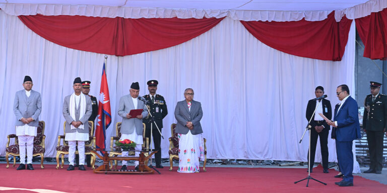 काठमाडौँ । राष्ट्रपति रामचन्द्र पौडेलले नवनियुक्त मधेस प्रदेशका प्रदेश प्रमुख सुरेन्द्र लाभ कर्णलाई पद तथा गोपनीयताको शपथ गराएका छन् । राष्ट्रपति कार्यालय शीतलनिवासमा आज आयोजित विशेष समारोहमा राष्ट्रपति पौडेलले कर्णलाई शपथ गराएको राष्ट्रपतिको स्वकीय सचिवालयले जनाएको छ । समारोहमा उपराष्ट्रपति रामसहाय प्रसाद यादव, प्रधानमन्त्री सुशीला कार्की, सभामुख देवराज घिमिरे, मन्त्रिगण, संवैधानिक निकायका प्रमुख तथा पदाधिकारी … Continue reading मधेस प्रदेशका प्रदेश प्रमुख कर्णले लिए शपथ