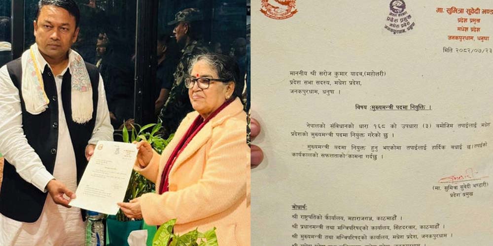 काठमाडौं । सोमबार दिनैभर मधेश प्रदेशको राजनीतिकमा बबन्डर मच्चियो । प्रदेश प्रमुख सुमित्रा सुवेदी भण्डारीले एकाबिहानै झिसमिसेमा नेकपा (एमाले)को संसदीय दलका नेता सरोजकुमार यादवलाई मुख्यमन्त्री नियुक्त गरिन् । त्यो पनि प्रदेश भवनमा होइन, बर्दिबासस्थित एक होटेलमा ।