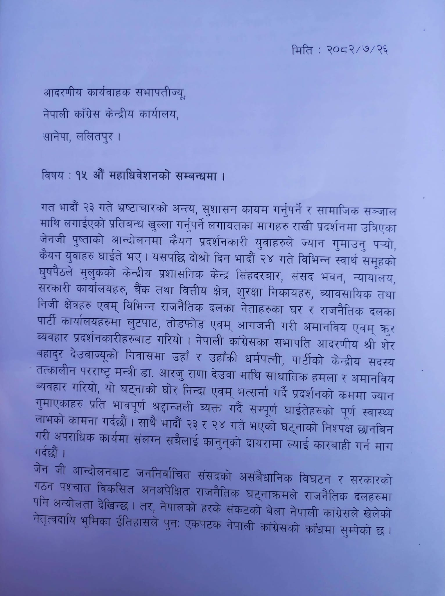 ‘आसन्न २०८२ साल फागुन २१ गतेको निर्वाचनलाई परिणाममुखी बनाउन पार्टीको विधान बमोजिम २०८२ साल मङ्सिर महिनाभित्र १५ औँ महाधिवेशन प्रारम्भ गरी तहगत रूपमा अधिवेशन सम्पन्न गर्नका लागि कार्यतालिका बनाई लागू गर्ने,’ज्ञापनपत्रमा उल्लेख छ ।