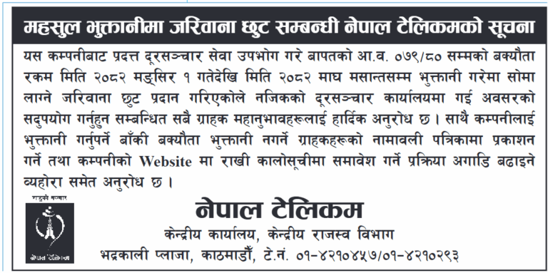 काठमाडौं । नेपाल टेलिकमको दूरसञ्चार सेवा उपभोग गरेबापतको बक्यौता रकम तीन महिनाभित्र तिरे जरिवाना नलाग्ने भएको छ ।