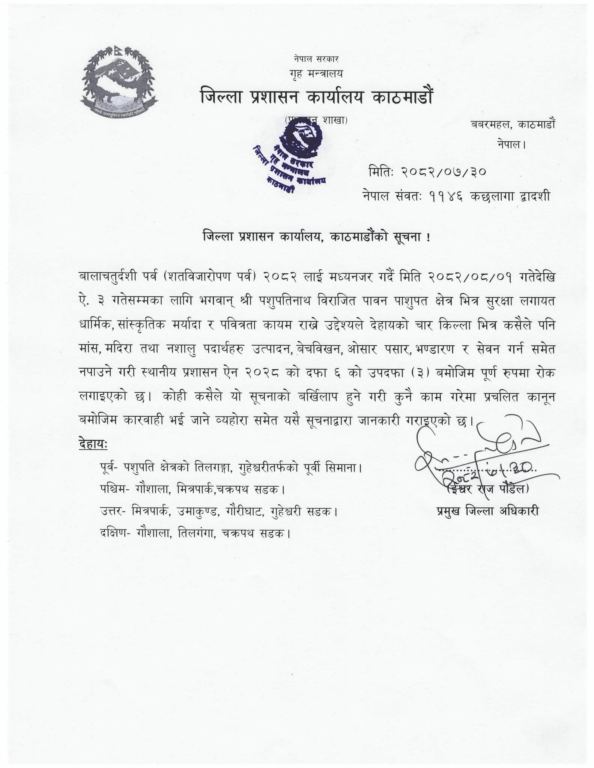 काठमाडौंका प्रमुख जिल्ला अधिकारी ईश्वरराज पौडेलले मासु, मदिरा तथा नशालु पदार्थहरू उत्पादन, बेचबिखन, ओसार पसार, भण्डारण र सेवन गर्न स्थानीय प्रशासन ऐन २०२८ को दफा ६ को उपदफा ९३० बमोजिम पूर्ण रूपमा रोक लगाइएको जानकारी दिए ।