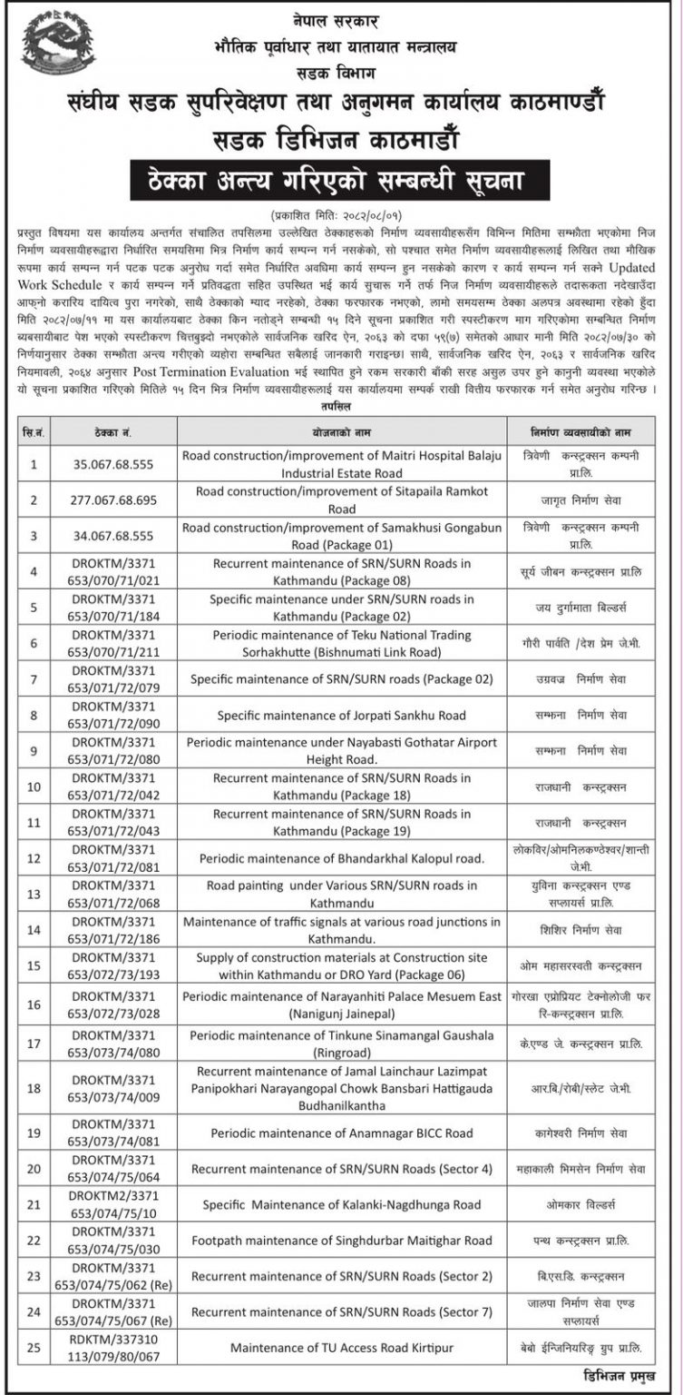 काठमाडौं । सरकारले सम्झौता भएका तर काम नगरेर अलपत्र पारिएका २५ रुग्ण ठेक्का तोडेको छ । सडक डिभिजन कार्यालय काठमाडौंले आर्थिक वर्ष २०६७/६८ देखि २०७९/८० मा सम्झौता भएका तर काम नगरेर अलपत्र पारिएका रुग्ण ठेक्का सोमबार तोडेको हो ।