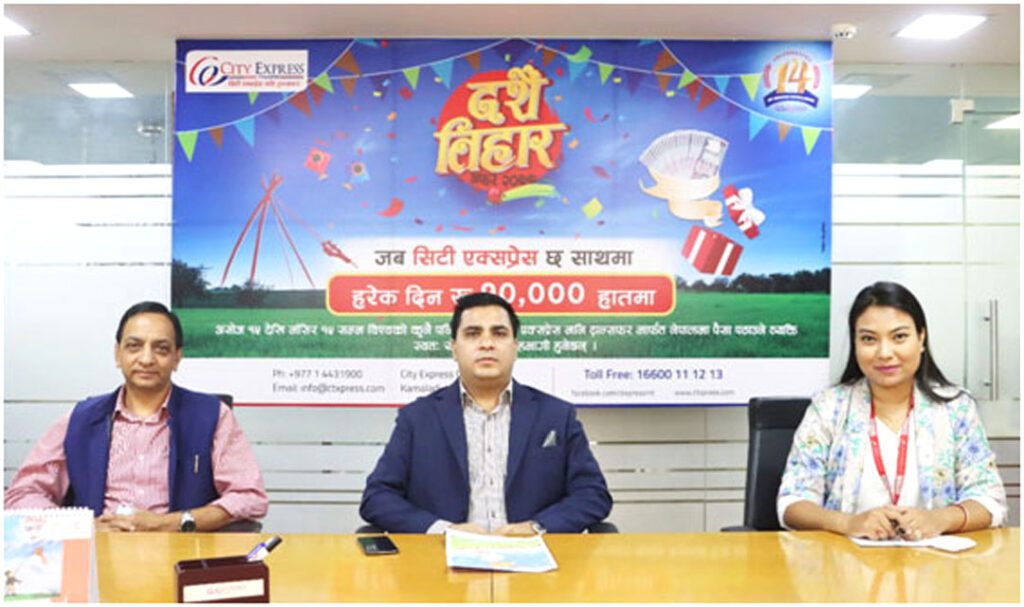 काठमाडौं । सिटी एक्सप्रेस मनी ट्रान्सफरले समस्त नेपालीहरुको महान् चाड दशैँ, तिहार र छठलाई लक्षित गर्दै आफ्ना ग्राहकवर्गसँग पर्वको खुशी साट्न लगातार ६० दिनसम्म चल्ने ‘जब सिटी एक्सप्रेस छ साथमा, हरेक दिन रु १०,००० हातमा’ उपहार योजना घोषणा गरेको छ ।