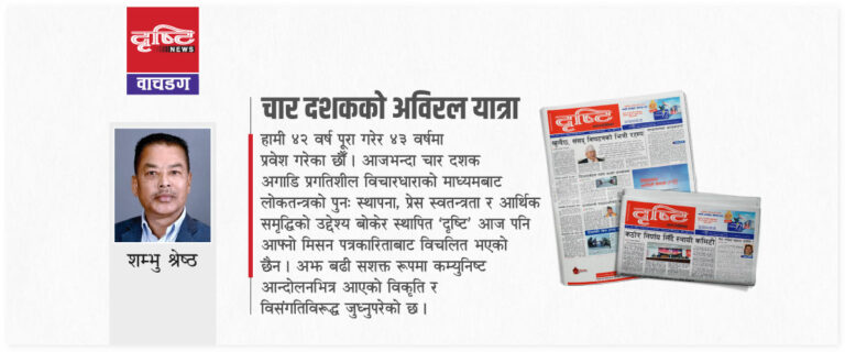 यो अंकदेखि हामी ४२ वर्ष पूरा गरेर ४३ वर्षमा प्रवेश गरेका छौँ । आजभन्दा चार दशक अगाडि प्रगतिशील विचारधाराको माध्यमबाट लोकतन्त्रको पुनः स्थापना, प्रेस स्वतन्त्रता र आर्थिक समृद्धिको उद्देश्य बोकेर स्थापित ‘दृष्टि’ आज पनि आफ्नो मिसन पत्रकारिताबाट विचलित भएको छैन । अझ बढी सशक्त रूपमा कम्युनिष्ट आन्दोलनभित्र आएको विकृति र विसंगतिविरुद्ध जुध्नुपरेको छ ।