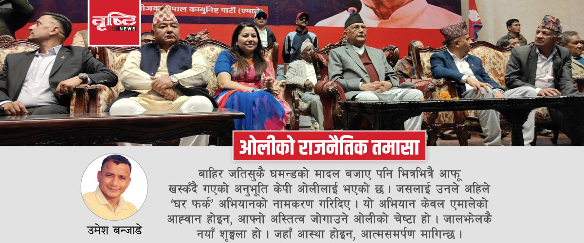 बाहिर जतिसुकै घमन्डको मादल बजाए पनि भित्रभित्रै आफू खस्कँदै गएको अनुभूति केपी ओलीलाई राम्रोसँग भएको छ । जसलाई उनले अहिले ‘घर फर्क’ अभियानको नामकरण गरेका छन् । हुन त यो अभियान पनि जालझेलकै नयाँ शृङ्खला हो । जहाँ आस्था होइन, आत्मसमर्पण मागिन्छ ।