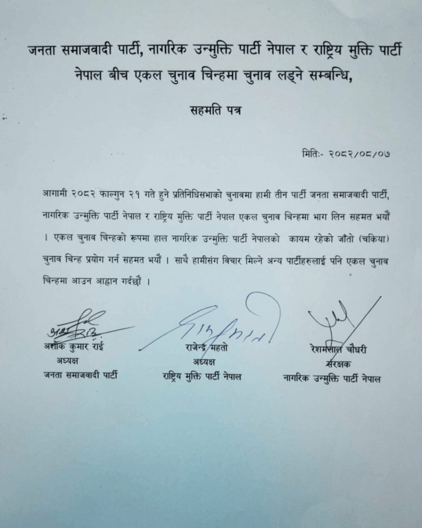 ‘आगामी फागुन २१ गते हुने प्रतिनिधिसभाको चुनावमा हामी तीन पार्टी जनता समाजवादी पार्टी, नागरिक उन्मुक्ति पार्टी नेपाल र राष्ट्रिय मुक्ति पार्टी नेपाल एकल चुनाव चिह्नमा भाग लिन सहमत भयौँ, एक चुनाव चिह्नको रूपमा हाल नागरिक उन्मुक्ति पार्टी नेपालको कायम रहेको जाँतो (चकिया) चुनाव चिह्न प्रयोग गर्न सहमत भयौँ,’ तीन पार्टीबीच भएको सहमति पत्रमा उल्लेख छ ।साथै विचार मिल्ने अन्य पार्टीहरूलाई पनि एकल चुनाव चिह्नमा आउन आह्वान गरिएको छ ।