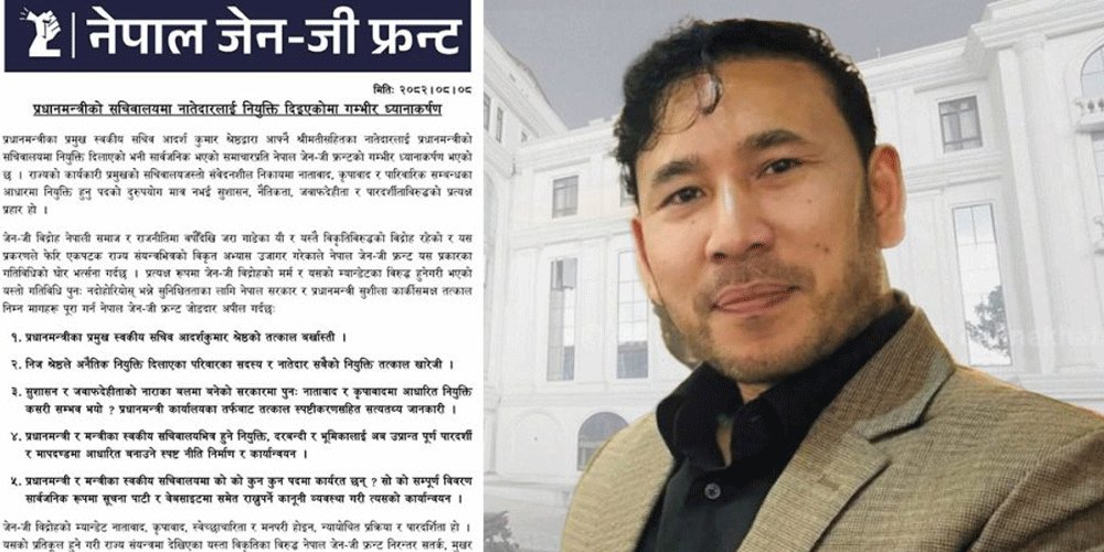 ‘आखिर के का लागि ? जेनजी विद्रोह रकमको भ्रष्टाचार बिरूद्ध मात्र नभई नैतिक भ्रष्टाचार, नातावाद, कृपावाद बिरूद्ध पनि थियो । भाद्र २३ मा हामीले सुशासन, पारदर्शिता र जवाफदेहिताको पक्षमा नारा लगाएका थियौं’ बमले भनेकी छन्, ‘तर नागरिक सरकारको प्रधानमन्त्रीका प्रमुख स्वकिय सचिवले नातावाद र कृपावाद अंगालेर नैतिक भ्रष्टाचार गर्दै जसरी श्रीमतीसहित अन्य नातेदारलाई जेनजी विद्रोह कै बलमा जागिर लगाउने काम गरेका छन, त्यो सरासर गलत भएको छ ।’