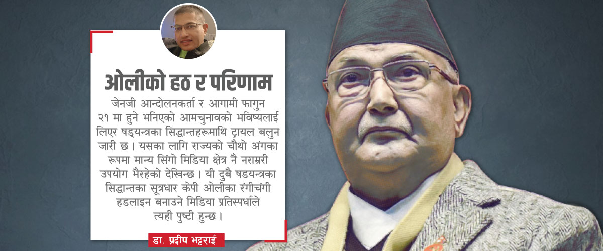 ओलीको यो तयारीले चुनाव त भाँडिन्छ नै, देश पनि फेरि अर्को भिडन्तमा फस्ने लगभग निश्चित छ । केही दिनयता सिमरा, विराटनगर, दुहबीलगायतका स्थानमा ओलीका भिजिलान्तेहरूले गरेको अवाञ्छित क्रिया र जेनजीहरूको प्रतिक्रिया त्यसैको सुरूवात हो ।