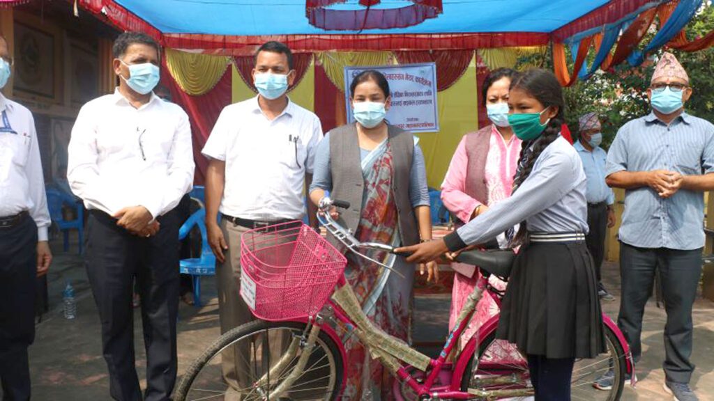 कोभिडका कारण अघिल्लो आर्थिक वर्षमा साइकल हस्तान्तरण गर्न नसकिएकाले यसपटक साइकल हस्तान्तरण गरिएको महानगर प्रमुख रेनु दाहालले बताइन् । भरतपुर २२ को पटिहानीमा रहेको आधारभुत विद्यालयमा एक कार्यक्रम गरी महानगर प्रमुख दाहालले ५ वटा वडाका १७ वटा विद्यालयका १३५ जना विपन्न परिवारका छात्राहरुलाई साइकल वितरण गरिन् । प्रतिवडा २७ साइकलका दरले महानगरका १३, १४, २२, २३, २४ नम्बर वडाका विद्यार्थीलाई साइकल वितरण गरिएको हो ।
