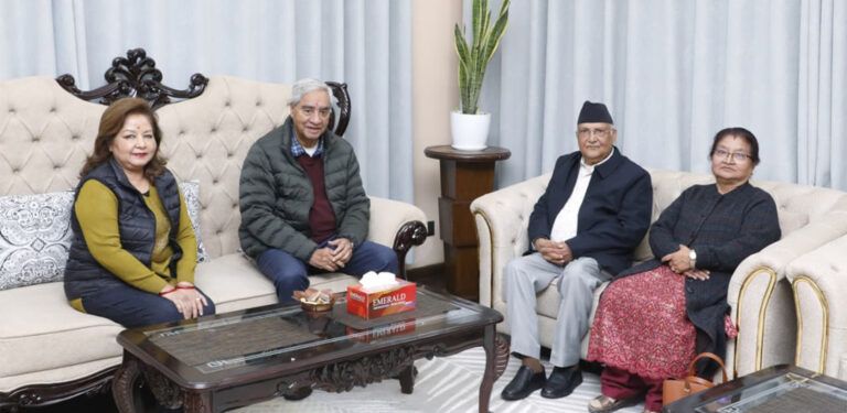 महाराजगञ्जस्थित देउवा निवासमा शुक्रवार भेट भएको हो ।  भेटवार्तामा देउवा पत्नी आरजु राणा देउवा र ओली पत्नी राधिका शाक्य पनि सहभागी थिए ।