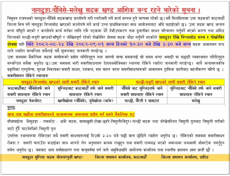 नागढुङ्गा–मुग्लिङ सडक योजना, काठमाडौँ र धादिङ जिल्ला प्रशासन कार्यालयले संयुक्त सूचना जारी गर्दै सवारी आवागमनमा रोक लगाइएको जानकारी दिएका छन्। सडक कालोपत्रे र चौडा बनाउने कार्यका लागि रोक आवश्यक भएको आयोजनाले जनाएको छ।