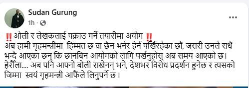 गुरुङले स्टाटसमा लेखेका छन् “अब हामी गृहमन्त्रीमा हिम्मत छ कि छैन भनेर हेर्दै छौँ। उनले जति पटक ‘छानबिन आयोगको लागि पर्खनुहोस्’ भने अब समय आइसकेको छ। यदि अब पनि बोली अनुसार कदम चालिएन भने देशभर विरोध प्रदर्शन हुनेछ, र त्यसको सम्पूर्ण जिम्मेवारी गृहमन्त्रीले नै लिनुपर्छ।”
