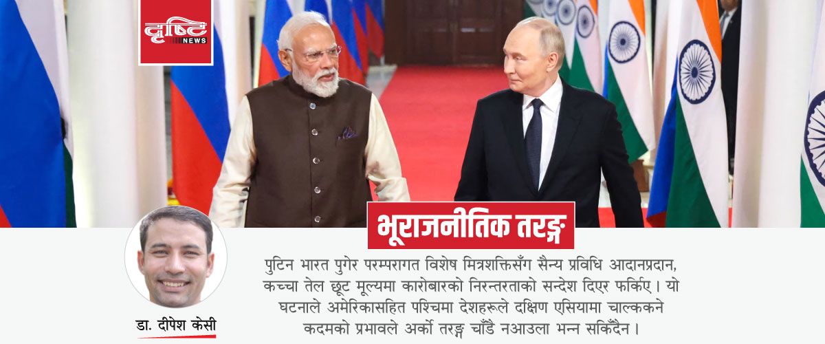 सैन्य दृष्टिले विश्वका सबैभन्दा बलियो मानिएका अमेरिका र रुसको दक्षिण एसियाका क्षेत्रीय शक्तिहरुमार्फत् भूराजनीतिक प्रभाव बनाउने होडबाजी छ । यही होडबाजीका क्रममा पुटिन भारत पुगेर परम्परागत विशेष मित्रशक्तिसँग सैन्य प्रविधि आदानप्रदान, कच्चा तेल छूट मूल्यमा कारोबारको निरन्तरताको सन्देश दिएर फर्किए । यो घटनाले अमेरिकासहित पश्चिमा देशहरूले दक्षिण एसियामा चाल्ने कदमको प्रभावले अर्को तरङ्ग चाँडै नआउला भन्न सकिँदैन ।