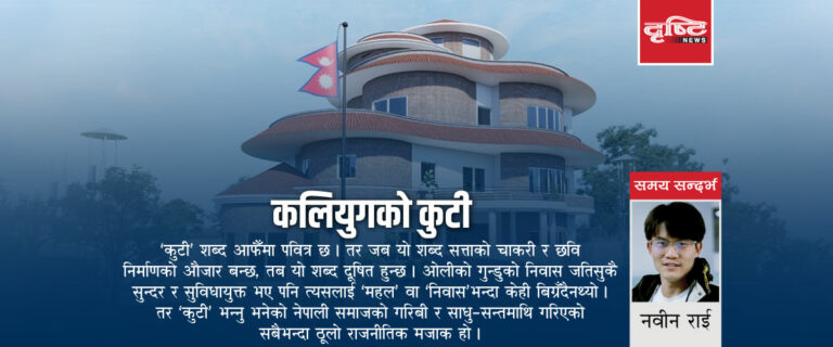 ‘कुटी’ शब्द आफैँमा पवित्र छ । तर जब यो शब्द सत्ताको चाकरी र छवि निर्माणको औजार बन्छ, तब यो शब्द दूषित हुन्छ । ओलीको गुन्डुको निवास जतिसुकै सुन्दर र सुविधायुक्त भए पनि त्यसलाई ‘महल’ वा ‘निवास’भन्दा केही बिग्रँदैनथ्यो । तर ‘कुटी’ भन्नु भनेको नेपाली समाजको गरिबी र साधु-सन्तमाथि गरिएको सबैभन्दा ठूलो राजनीतिक मजाक हो ।