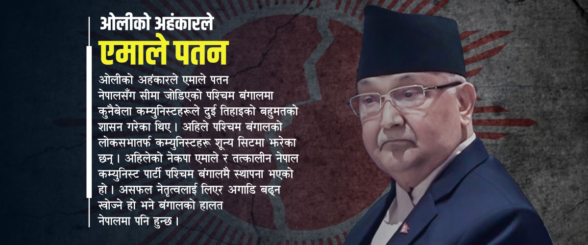विधानसभामा पनि उनीहरू केही सिटमा सीमित भइसके । अहिलेको नेकपा एमाले र तत्कालीन नेपाल कम्युनिस्ट पार्टी पश्चिम बंगालमै स्थापना भएको हो । एमालेले अहिलेकै असफल नेतृत्वलाई लिएर अगाडि बढ्न खोज्ने हो भने बंगालको हालत नेपालमा पनि हुन्छ । त्यस अवस्थामा नेपालमा कम्युनिस्टहरुको पतनको कारण एमाले अध्यक्ष ओली नै बन्नेछन् ।