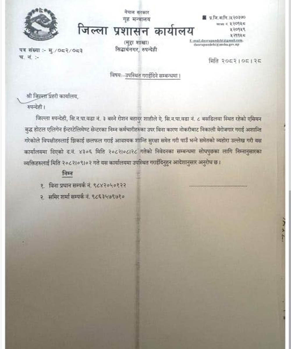 रुपन्देही । रुपन्देहीको भैरहवास्थित सिद्धार्थनगर–८ मा रहेको होटल एसियन बुद्धको इलिगेन्ट इन्टरटेन्मेन्ट सेन्टर (मिनि क्यासिनो)का विवादस्पद म्यानेजिङ डाइरेक्टर समीर शर्माको सक्रियताबारे उठेका प्रश्नहरूबीच त्यहाँ कार्यरत एक कर्मचारीले आफुलाई बिनाकारण जागिरबाट निकालेको र मानसिक तनाब दिएको भन्दै जिल्ला प्रसासन कार्यालय रुपन्देहीमा आइतबार उजुरी दिएका छन् ।
