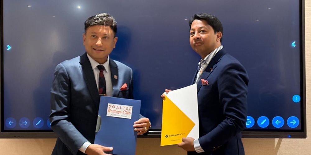 काठमाडौं । सिद्धार्थ बैंक र द सोल्टी होटेल्स् एन्ड रिसोर्टबीच बैंकका ग्राहकहरुलाई विभिन्न सेवामा छुट प्रदान गर्ने सम्बन्धी सम्झौता भएको छ ।
