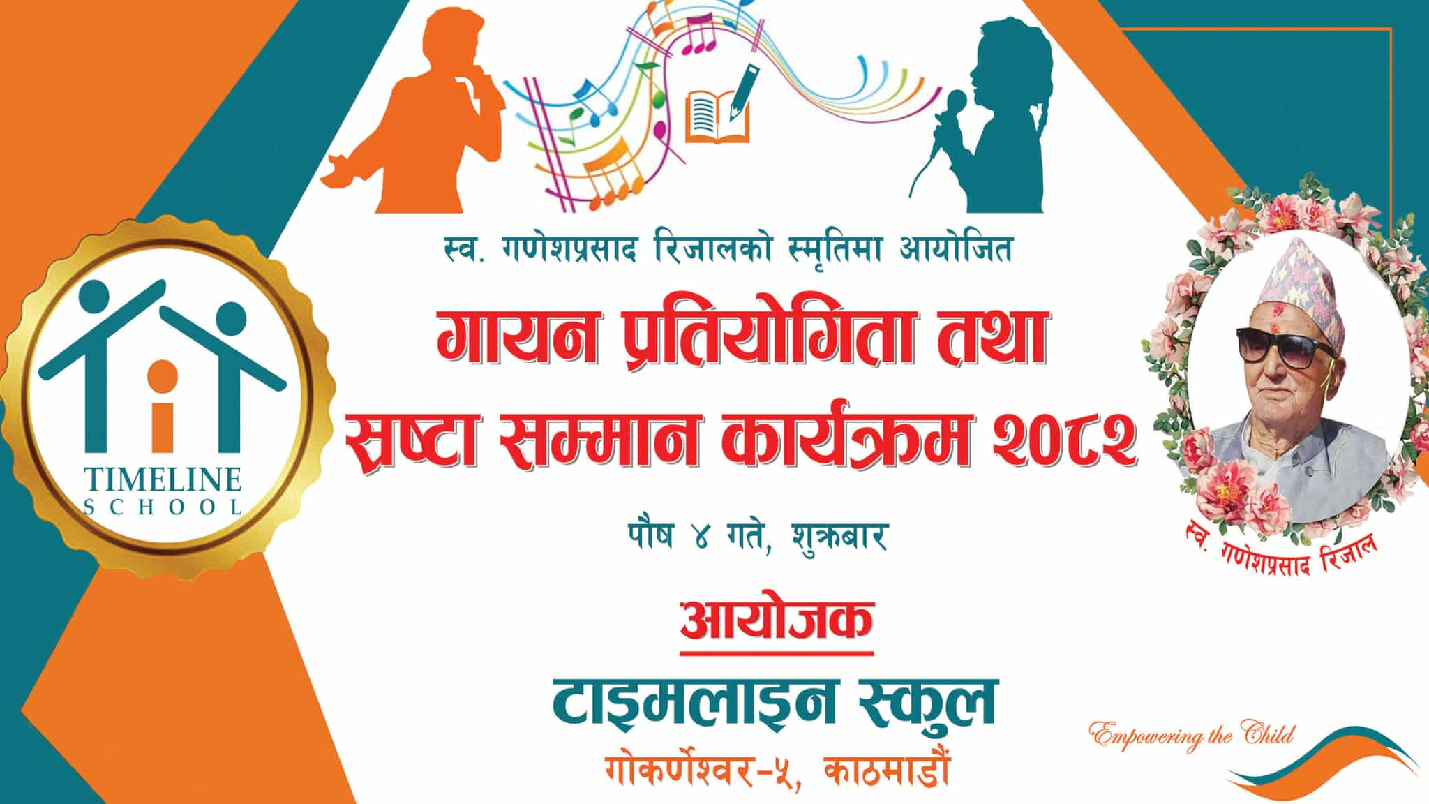काठमाडौं । टाइमलाइन विद्यालयले स्व. गणेशप्रसाद रिजालको पाँचौँ स्मृति दिवसमा गायन प्रतियोगिता तथा स्रष्टा सम्मान कार्यक्रम आयोजना गर्ने भएको छ ।